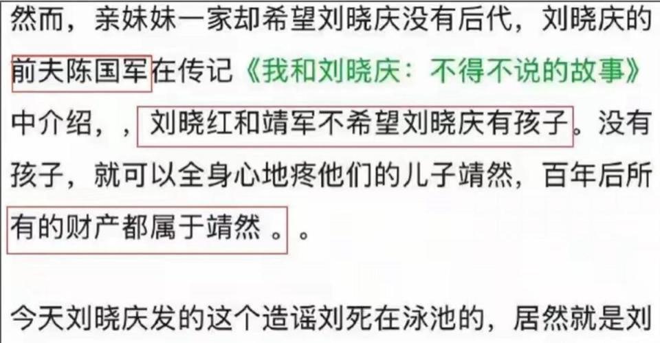 刘晓庆此前在公众认知中,始终扮演着 " 替代母亲 " 的角色。她曾多次透露,自 1985 年妹妹之子靖然出生仅 40 天起,便将其接至北京抚养,视如己出,承担其贵族教育、澳洲留学及房产车辆等巨额花费,早年更以 " 儿子 " 相称。其前夫陈国军在传记中亦提及,妹妹一家曾希望刘晓庆无子女,以便靖然继承财产。